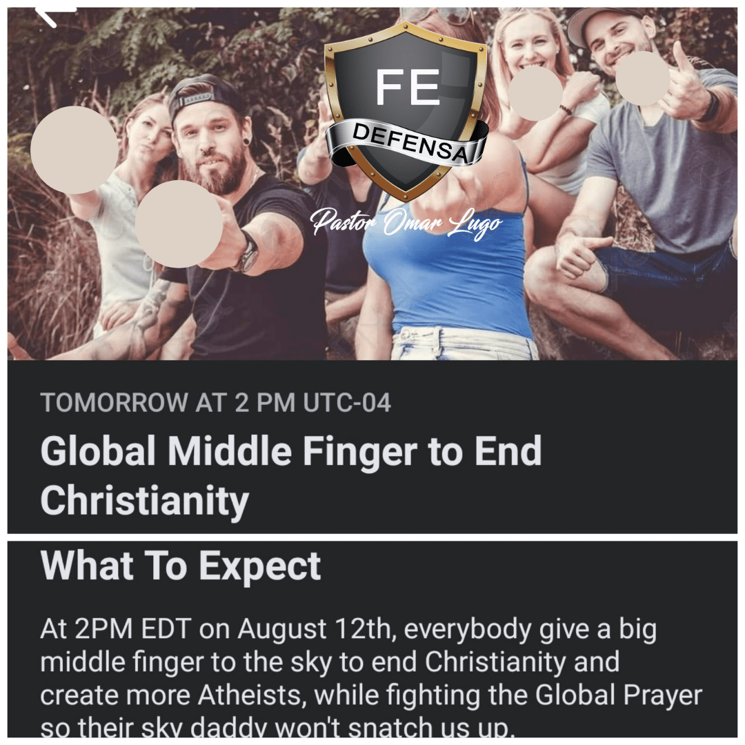 Como profeticamente ha de esperarce hay un ataque directo a la fe cristiana en estos ultimos dias. Esta actividad sera mañana donde y dice la descripcion de la activiada textualmente: “A las 2PM EDT del 12 de agosto, todos dan un gran dedo medio al cielo para acabar con el cristianismo y crear más ateos,ContinueContinue reading “Actividad para el fin del Cristianismo”